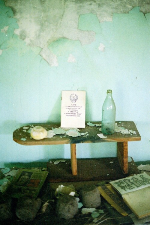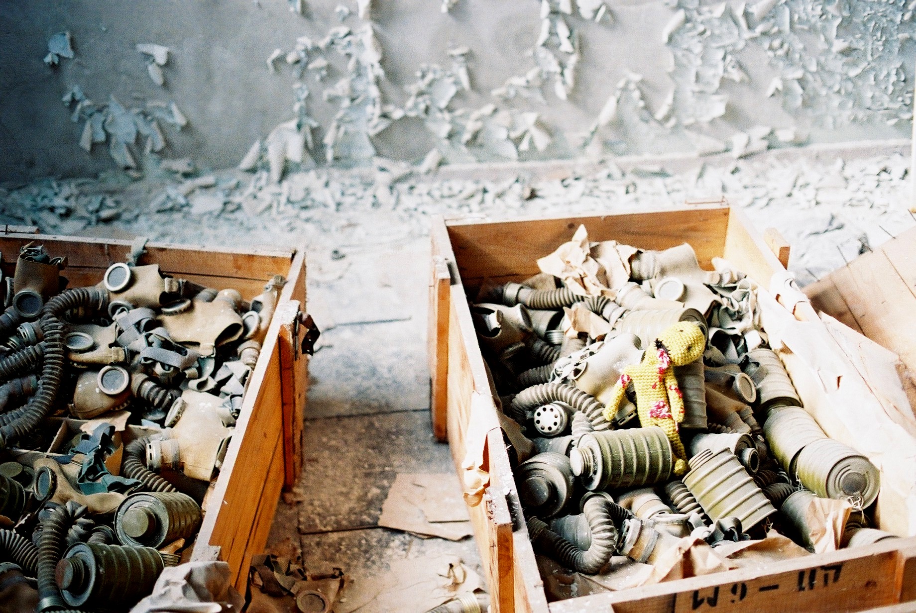 The most doleful place of all is the school. The floor and tables in every classroom are carpeted with papers: essays, projects, drawings, exercise books half-filled, textbooks half-deteriorated. The little artworks of children who either had to grow up in a foreign city or were denied that chance by the radioactive dust. Things that once held so much importance to some unknown person are now just another fleck in a sea of nuclear debris. Worse still are the toys, the dolls and soldiers that slump forlornly in dusty corners or gleefully display their pathos on desk tops. Then, at the top of a flight of stairs, two crates full of gas masks: a brute intrusion of the catastrophe itself into this poignant little mausoleum.