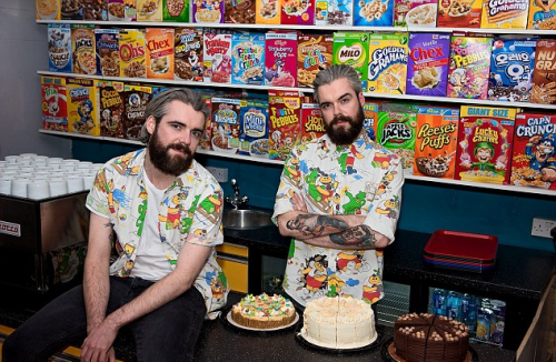 There are three things glaringly wrong with the Cereal Killer Café on Brick Lane in East London. Firstly, the menu consistently renders the word ‘raisins’ as ‘raisans’, which is incorrect. Secondly, it’s owned and managed by Gary and Alan Keery, a uniquely ghastly pair of identical twins. These two ghouls sport identical location-standard bushy beards, identical obnoxious slicked-back haircuts, identical smarmy expressions. Twins who do this kind of thing into adulthood are always hiding something hideous and perverse: when faced with such uncanny mirror-perfect duplication I can’t help but posit the necessary existence of a grotesque, hidden, third brother. Something scrabbling in the cellars, a cringing Smerdyakov figure onto whose memory all the suppressed differences between the superterranean Keerys has been displaced. A mad and vicious creature, whose pathological love for breakfast cereal turned him into something more beast than boy. His musty dungeon full of pencil-toppers and Rubik’s cubes, bobblehead dolls from the bottom of promotional packs, all nodding in unison with serene smiling faces as the idiot rubs cornflake dust into the stinking pits of his body. He slurps milk between sugar-stained pegs, he howls the advertising slogans between mouthfuls. His laugh rises from a constricted phlegmy giggle to the full manic convulsions of someone who sees the death of all reason perfectly reflected in the scrying-stone that is his morning bowl of Frosties. They had to kill him, of course, the twins, and they buried his heavy bones – glossy as enamel from all the fortifying calcium in his diet – below the foundations of what would become the UK’s first speciality breakfast cereal café. To seal the pact, they vowed to take on the same form, to be more than brothers, to be the same person, knowing what happened to the third twin, knowing that they might not be strong enough to face the darkness alone, that cruel gibbering malignancy always lurking beneath their quirky love for breakfast cereal. And so the madness of the murdered brother leeched into every brick of the place, until it became his empire.